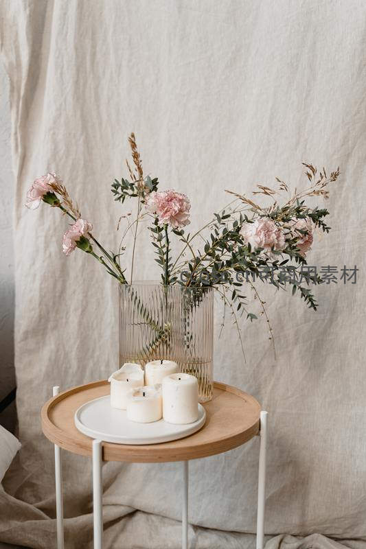 透明条纹花瓶中插着粉色康乃馨与干草,搭配白色蜡烛置于原木圆几上,米色亚麻布背景衬托出自然质朴又温柔治愈的居家美学。