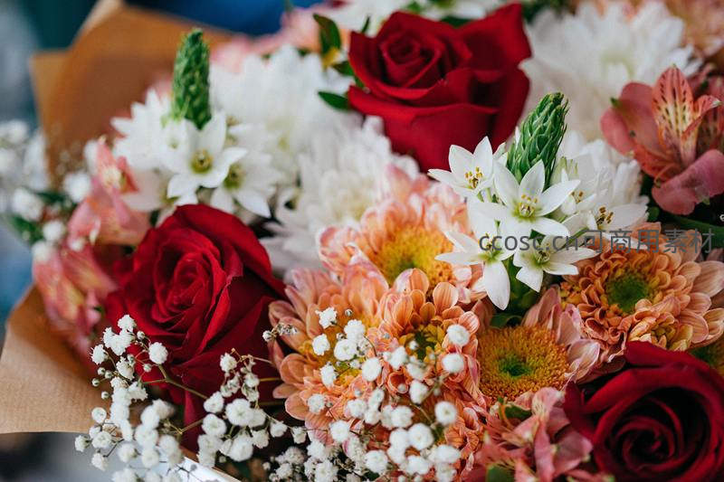 一束由鲜红玫瑰、橙色雏菊和白色满天星组成的精致花束,色彩鲜艳层次丰富,是表达爱意或庆祝节日的理想选择。