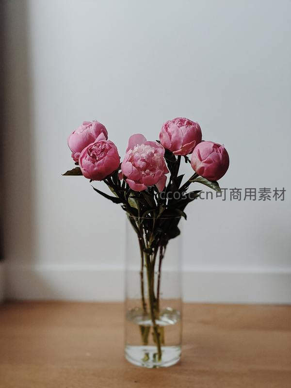 几支含苞待放的粉色芍药插在透明玻璃瓶中,置于木质桌面上,背景简洁,凸显花朵的柔美与宁静的居家氛围。