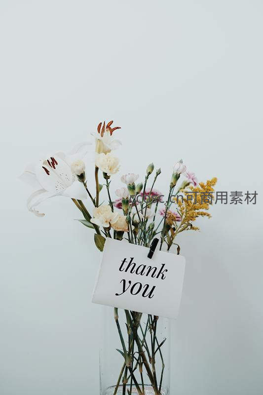 透明花瓶内插着以白色百合、康乃馨和黄色小花组成的混合花束,附带一张手写“thank you”卡片,整体风格干净温柔,充满感激之情。