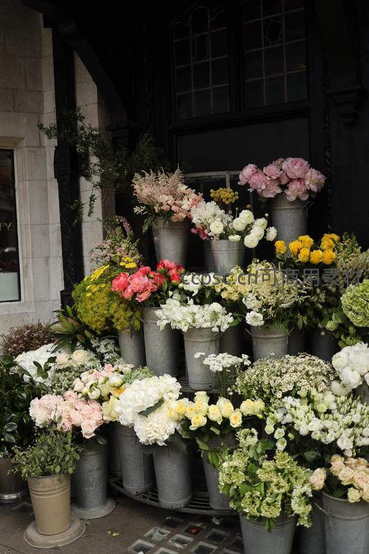 城市街角一家花店门口,金属桶里装满了各色鲜花,粉、黄、白交织,为喧嚣街道增添一抹生机与浪漫的商业风情。
