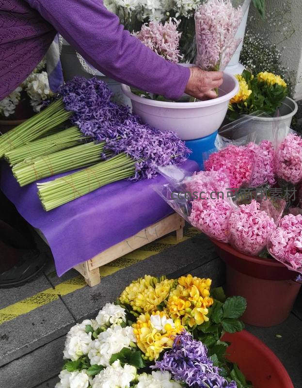花市摊位上紫粉色风信子与黄白花朵陈列待售