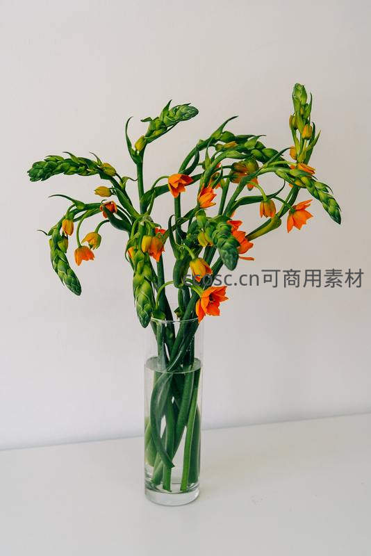 橙黄小花与青翠花苞盛放于高脚玻璃瓶,生机盎然