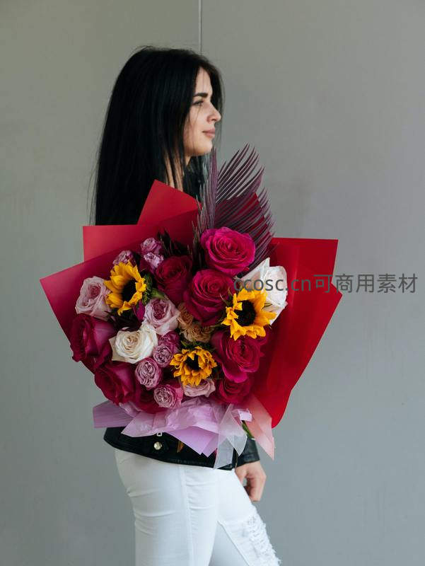黑发女子身着黑色皮衣与白色裤子,手持以红色玫瑰和向日葵为主的大花束,红色包装纸衬托出热烈氛围,姿态优雅迷人。