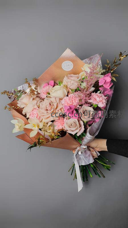 以柔和的粉色调为主,融合玫瑰、康乃馨与精致干花,搭配丝带装饰,整体风格浪漫雅致,是表达爱意或祝福的理想选择。