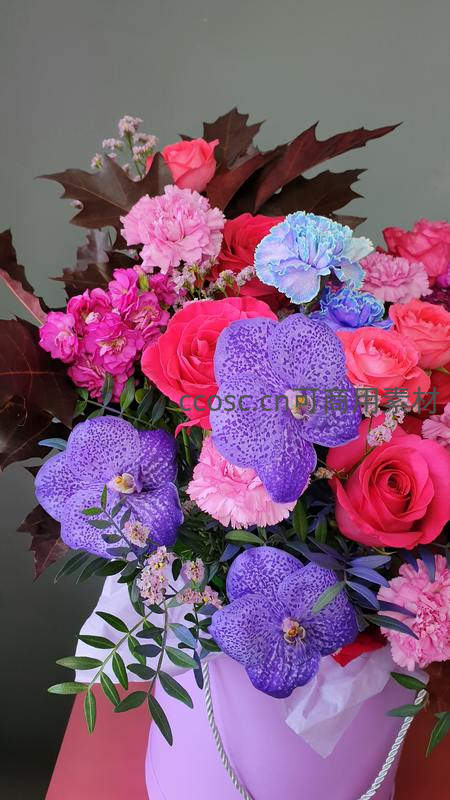 微距镜头下,紫色斑点兰花与粉红玫瑰、蓝色康乃馨交织绽放,细节清晰可见,展现花艺设计的精致与自然之美。