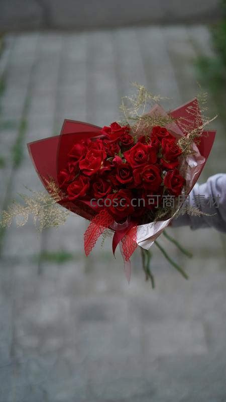一只手轻握着一束用红色包装纸装饰的红玫瑰花束,背景是模糊的石板路面,营造出一种即将赴约或表达心意的浪漫场景。