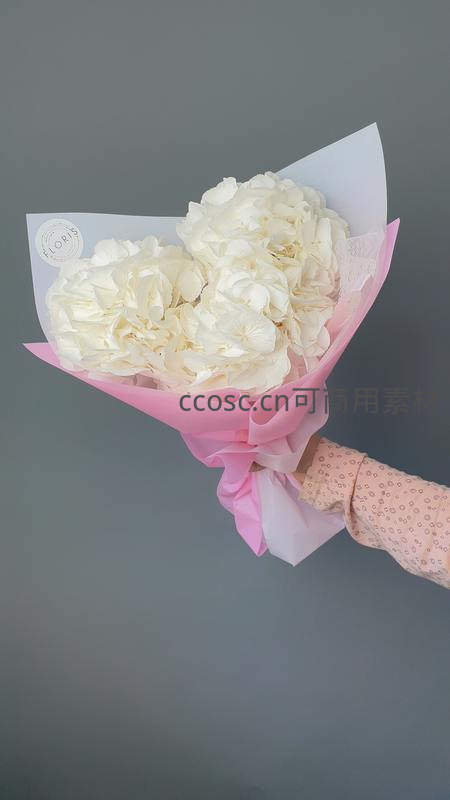 手捧白色绣球花束,粉色包装纸温柔点缀