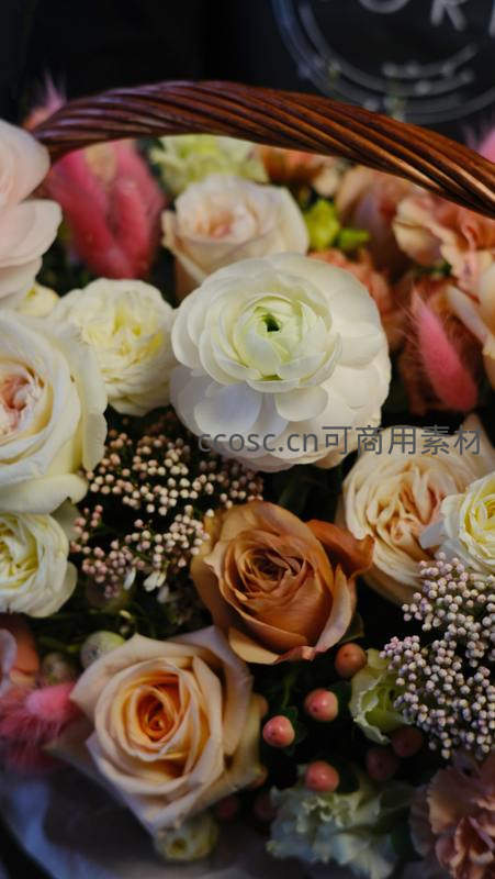 藤编花篮内装满杏色、米白与浅橙玫瑰,点缀小浆果与满天星,营造温暖复古的视觉效果,适用于婚礼布置或家居装饰,散发浪漫田园气息。