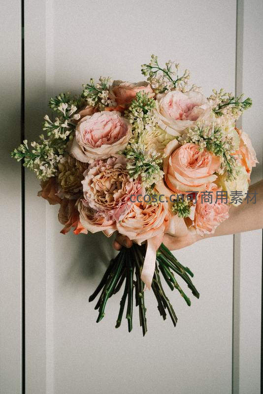 一束以粉橘色玫瑰为主的新娘捧花,搭配细碎绿叶与小白花,手持于门前柔光下,整体色调温柔梦幻,完美契合婚礼主题,彰显幸福与甜蜜。