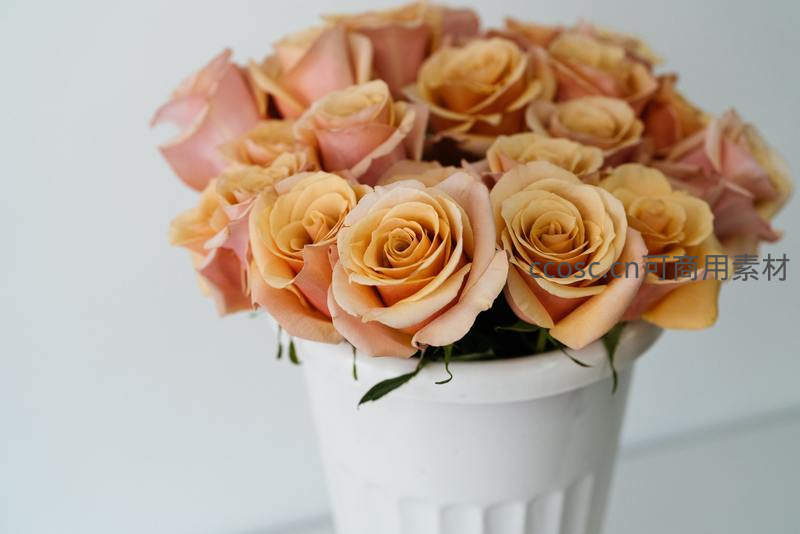 一束暖色调的玫瑰花优雅地插在简约的白色花瓶里,花瓣层层叠叠,色彩柔和温馨,营造出宁静浪漫的氛围。