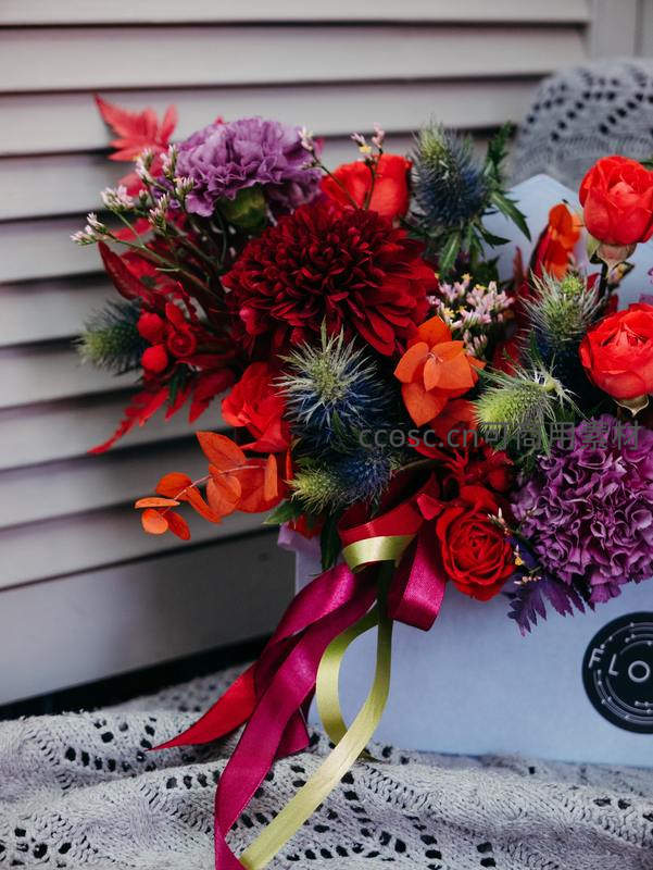 鲜艳的红、紫、橙色花朵搭配刺球与绿叶,用丝带精心包装在礼盒中,充满节日喜庆感,适合送礼或庆典装饰。