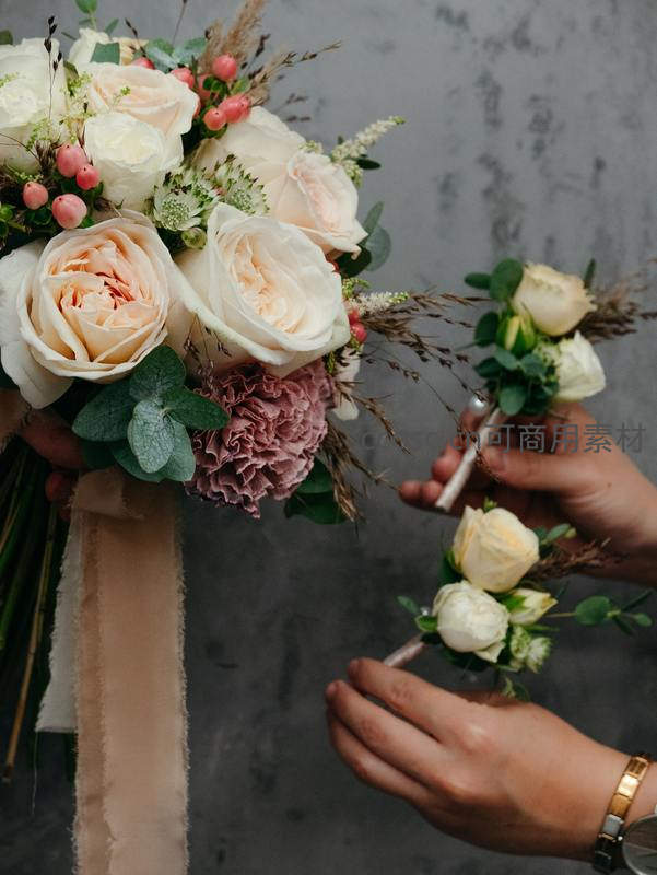 精致的婚礼手捧花与腕花由浅粉玫瑰和绿叶组成,手工细节清晰可见,展现婚礼花艺的柔美与仪式感。