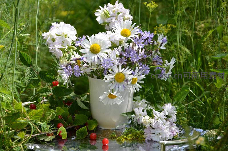 白色陶瓷花瓶中插满雏菊和紫色小花,周围散落着鲜红浆果与绿叶,置于户外草地上,展现出自然野趣与田园生活的宁静美好。