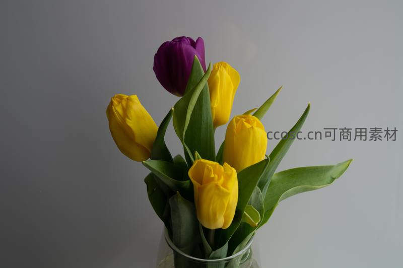 透明玻璃瓶中插着几支鲜艳的黄色和一朵深紫色郁金香,绿叶衬托下更显生机勃勃,背景简洁突出花的纯粹美感。