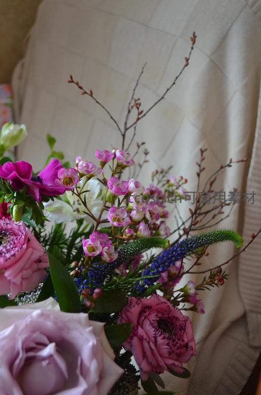 近距离拍摄的粉紫色系花束,包含玫瑰、洋桔梗等,背景是柔软的米色织物,整体色调柔和,细节丰富,充满女性温柔气质。