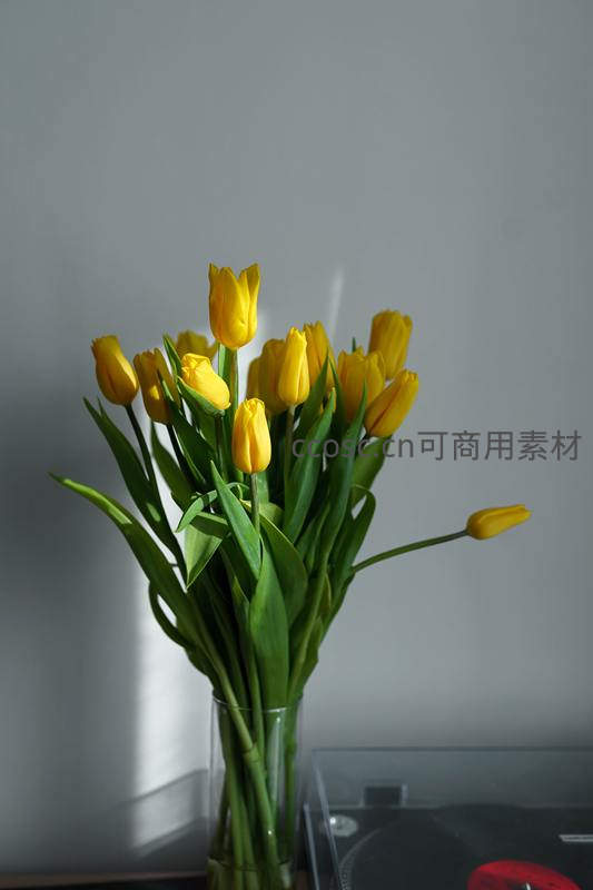 一大束鲜亮的黄色郁金香插在透明玻璃瓶中,阳光从一侧洒入,照亮花瓣与绿叶,为室内带来温暖与活力的视觉享受。