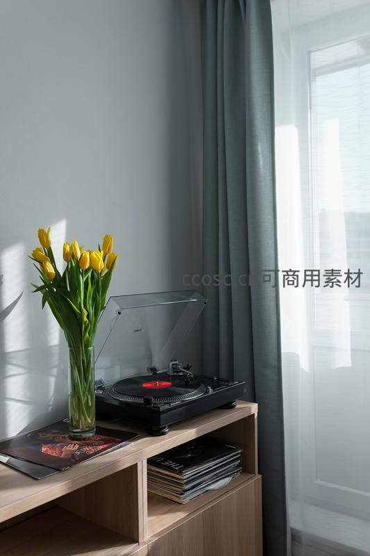 阳光透过窗帘洒在木质置物架上,黑色唱机旁摆放着一束鲜黄郁金香,营造温馨文艺的居家氛围。
