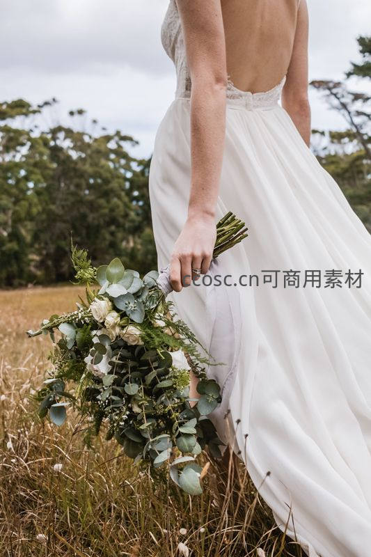 新娘背对镜头,身着露背白色长裙,手提一束以尤加利叶和白色玫瑰为主的野趣花束,置身于金黄草地与绿树环绕的自然风光中。
