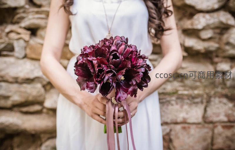 新娘身着洁白礼服,双手轻握一束深紫色郁金香花束,背景是古朴的石墙,营造出优雅而神秘的婚礼氛围。