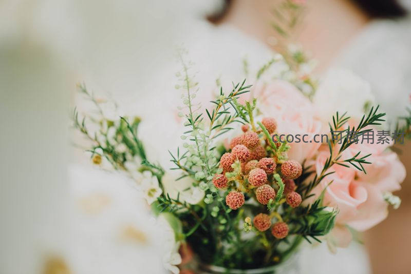 微距镜头捕捉到新娘花束中的粉色玫瑰与细小球状绿植,色彩柔和、层次丰富,展现婚礼花艺的精致与细腻之美。