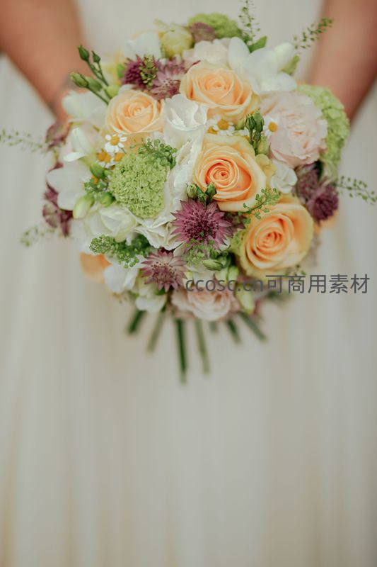柔和色调新娘捧花,橙粉玫瑰与绿植相映
