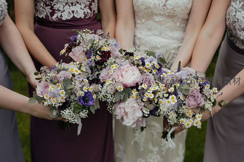 伴娘团手持紫粉系野花花束合影留念
