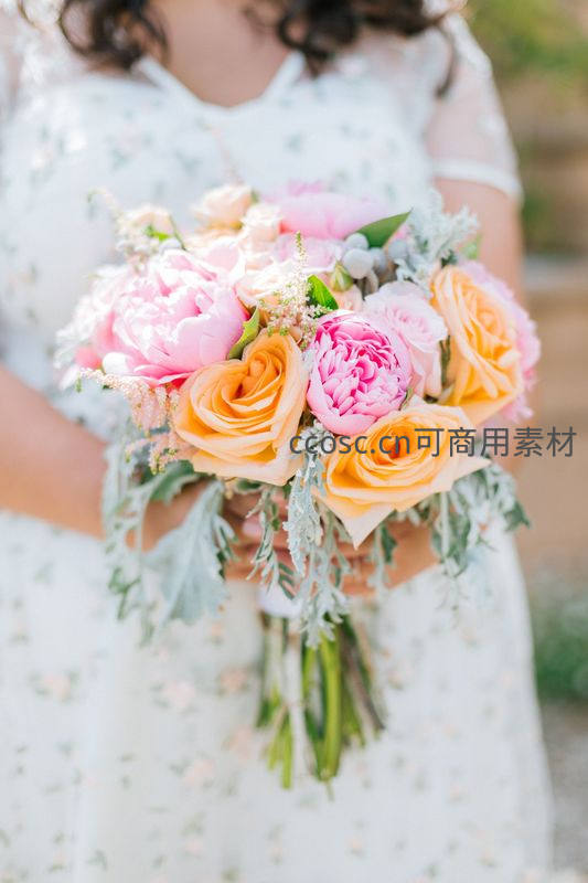 少女怀抱粉橙玫瑰与牡丹的春日花束