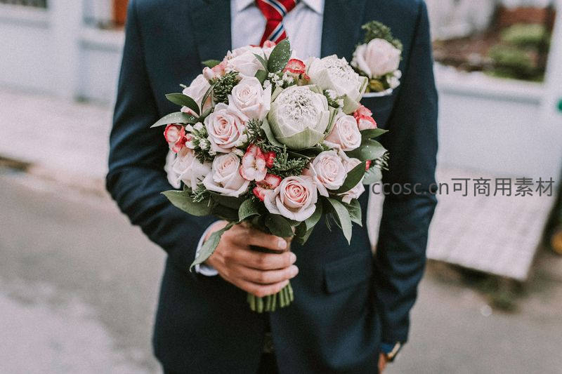 新郎身着深色西装,胸前佩戴同款胸花,双手稳稳捧住由粉白玫瑰与绿叶组成的花束,展现出庄重而温柔的新婚姿态。