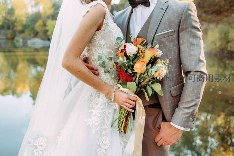 一对新人在湖边相拥,新娘手捧橙黄调秋日花束,新郎穿着格纹西装,倒映在水中的金黄树林为画面增添了诗意与温馨。