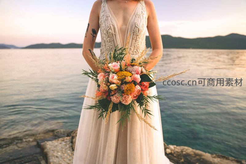 新娘背对镜头站在海边岩石上,身穿精致蕾丝婚纱,手中捧着色彩斑斓的鲜花花束,身后是波光粼粼的大海和温柔的日落余晖,画面唯美动人。