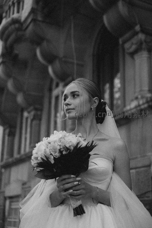 一位身着洁白婚纱的新娘,在古典建筑前侧身凝望,手持花束,神情宁静而充满期待,黑白影调更添艺术感与永恒之美。