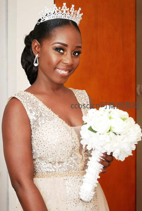 新娘头戴精致皇冠,身穿镶钻礼服,手持白玫瑰花束,笑容灿烂自信,展现出高贵典雅与幸福喜悦交织的迷人风采。
