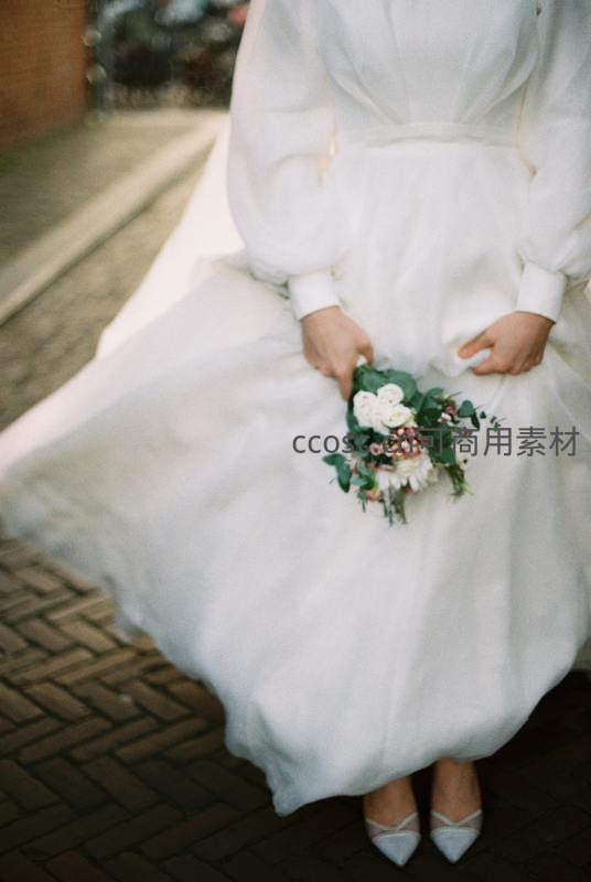 新娘身穿简约白色长袖婚纱,站在砖石街道上,双手轻握一束以白玫瑰和绿叶为主的清新花束,脚踩浅色尖头高跟鞋,整体氛围温柔恬静。