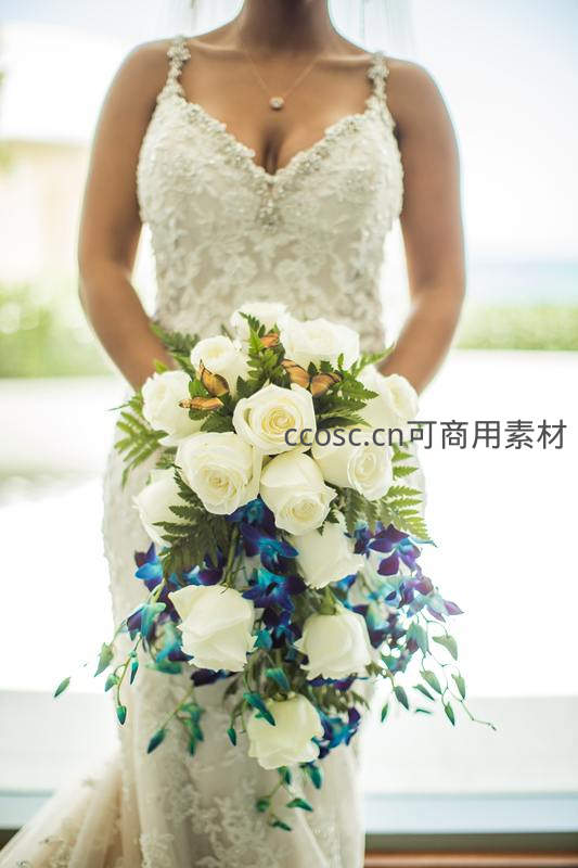 白玫瑰蓝兰花瀑布花束,新娘优雅伫立