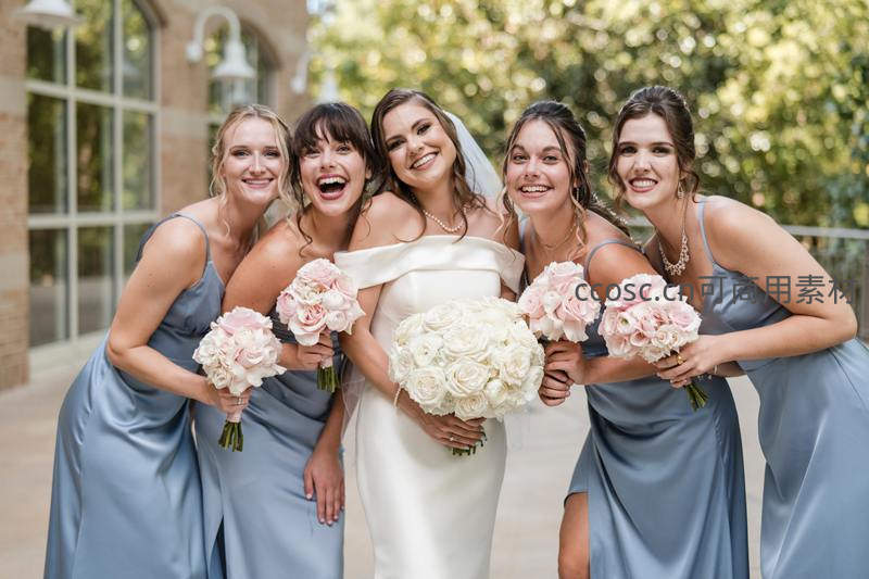 新娘身着优雅白纱,与四位身穿浅蓝礼服的伴娘在庭院中欢乐合影,手持粉色花束,背景绿树成荫,氛围温馨浪漫。