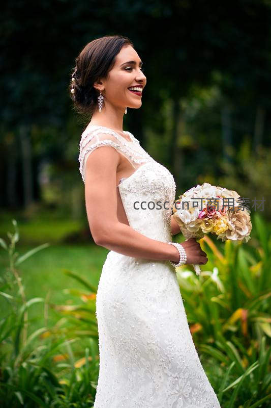 新娘身着珠饰婚纱,侧身微笑望向远方,手中捧着色彩柔和的混合花束,置身于绿植环绕的花园中,画面清新动人。