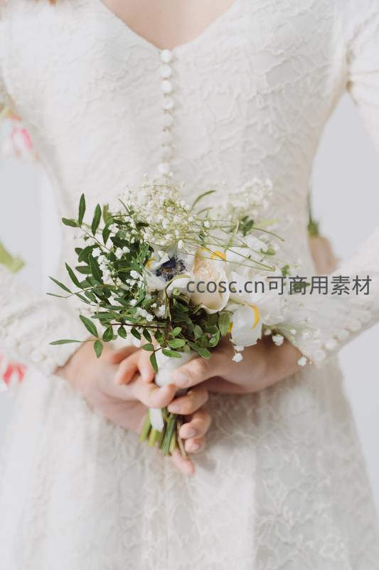 镜头聚焦新娘双手轻握的婚礼花束,以白色玫瑰和满天星为主,点缀翠绿枝叶,搭配蕾丝长袖婚纱,展现细腻柔美的瞬间。