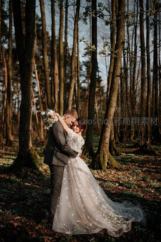 一对新人在高大挺拔的森林中深情相拥,新娘穿着飘逸的浅色婚纱,新郎身着灰色西装,阳光透过树梢洒下,营造出梦幻氛围。