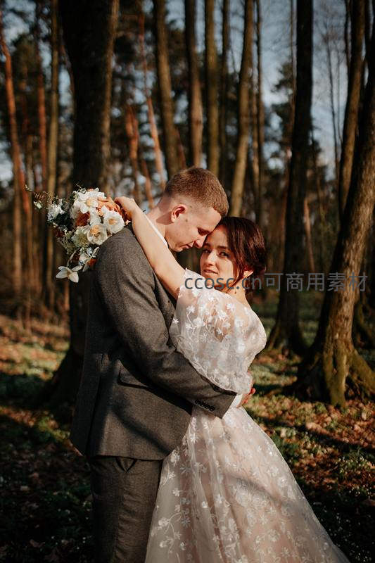 新郎新娘在森林中亲密依偎,额头轻触,新娘手捧花束搭在新郎肩上,两人眼神交汇充满爱意,周围是斑驳光影与静谧树林。