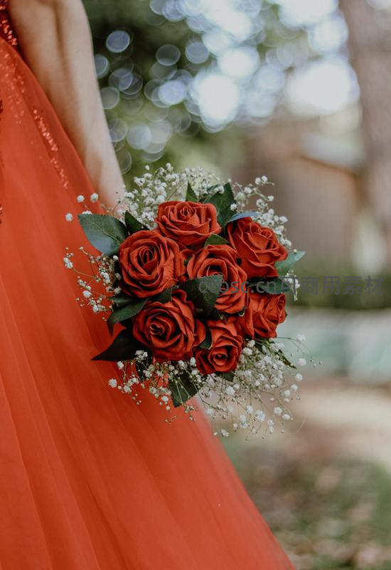 新娘身穿鲜艳橙色长裙,手捧一束饱满的红玫瑰与满天星,背景虚化自然光斑,凸显花束的质感与热烈氛围。