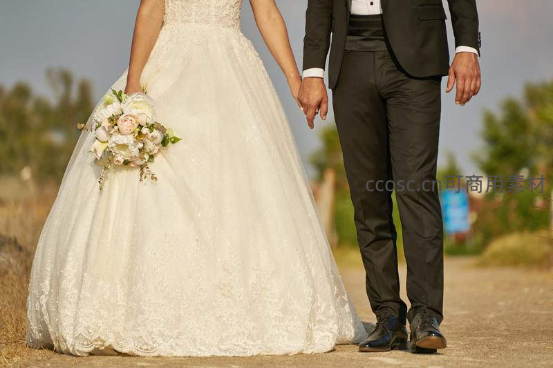 新人携手走在乡间土路上,新娘白色蕾丝长裙随风轻摆,新郎黑色正装挺拔,背影温馨宁静,尽显幸福时刻。