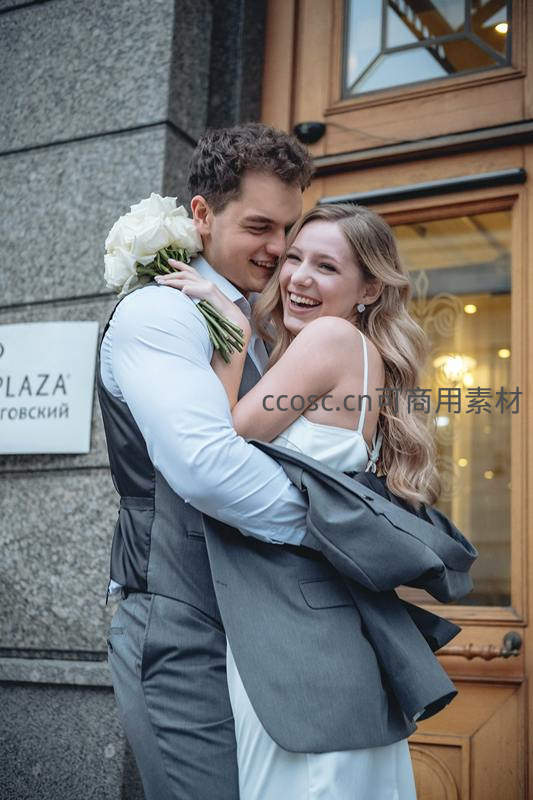 新婚夫妇在城市街角热情拥抱,新娘手捧白玫瑰,两人笑容灿烂,背景建筑与暖光窗棂烘托出都市婚礼的现代与温馨感。