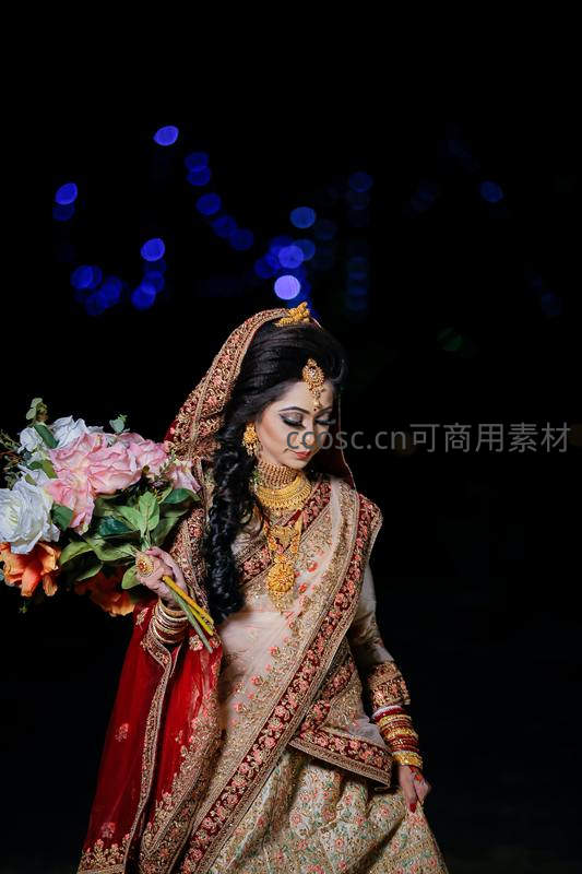 印度新娘盛装持花,金饰璀璨夜景迷人