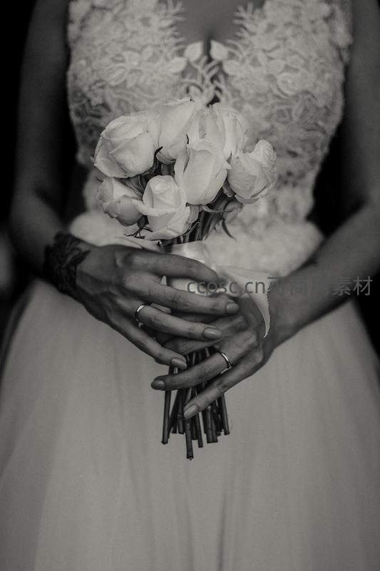 黑白照片中,新娘身着精致蕾丝婚纱,双手轻柔环抱一束洁白玫瑰,戒指在指间闪烁,传递出永恒与纯粹的爱情力量。