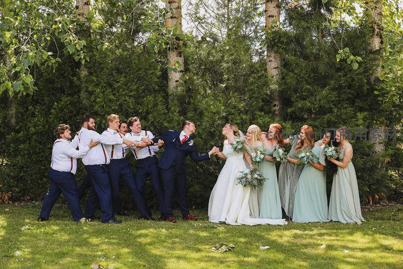 户外婚礼欢乐瞬间,新郎新娘与伴郎伴娘团嬉戏