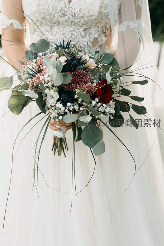 新娘手中捧着一束色彩丰富、层次分明的创意花束,包含深红玫瑰、蓝色蓟花、灰绿色尤加利叶及细长草叶,展现独特审美与艺术感。