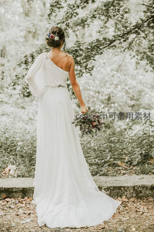 新娘身着简约单肩白色长裙,背对镜头漫步于林间小径,发髻插着鲜花,手提花束,阳光透过树梢洒落,营造出如梦似幻的童话氛围。
