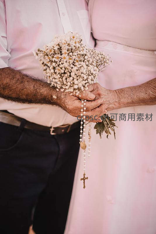 一对老年夫妇双手相握,共同捧着一束小白花,女士手中还垂着一串珍珠十字架念珠,画面传递出历经沧桑、相濡以沫的深厚情感。