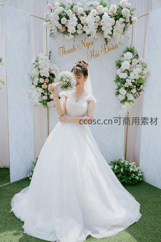 新娘身穿洁白婚纱,手持精致花束,在鲜花拱门下微笑,背景是精心布置的花卉装饰,营造出浪漫温馨的婚礼氛围。